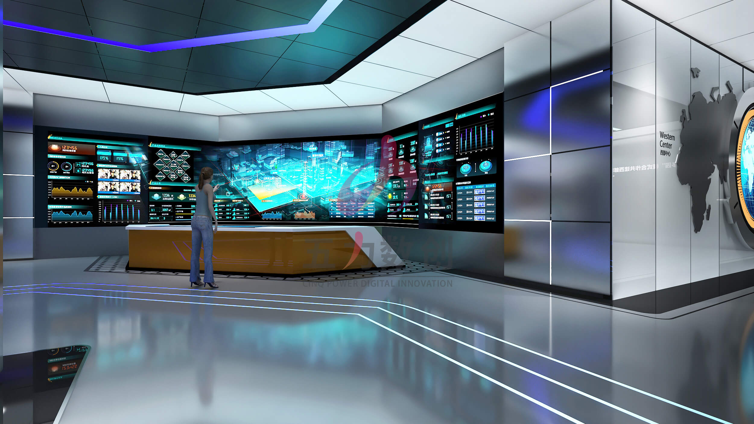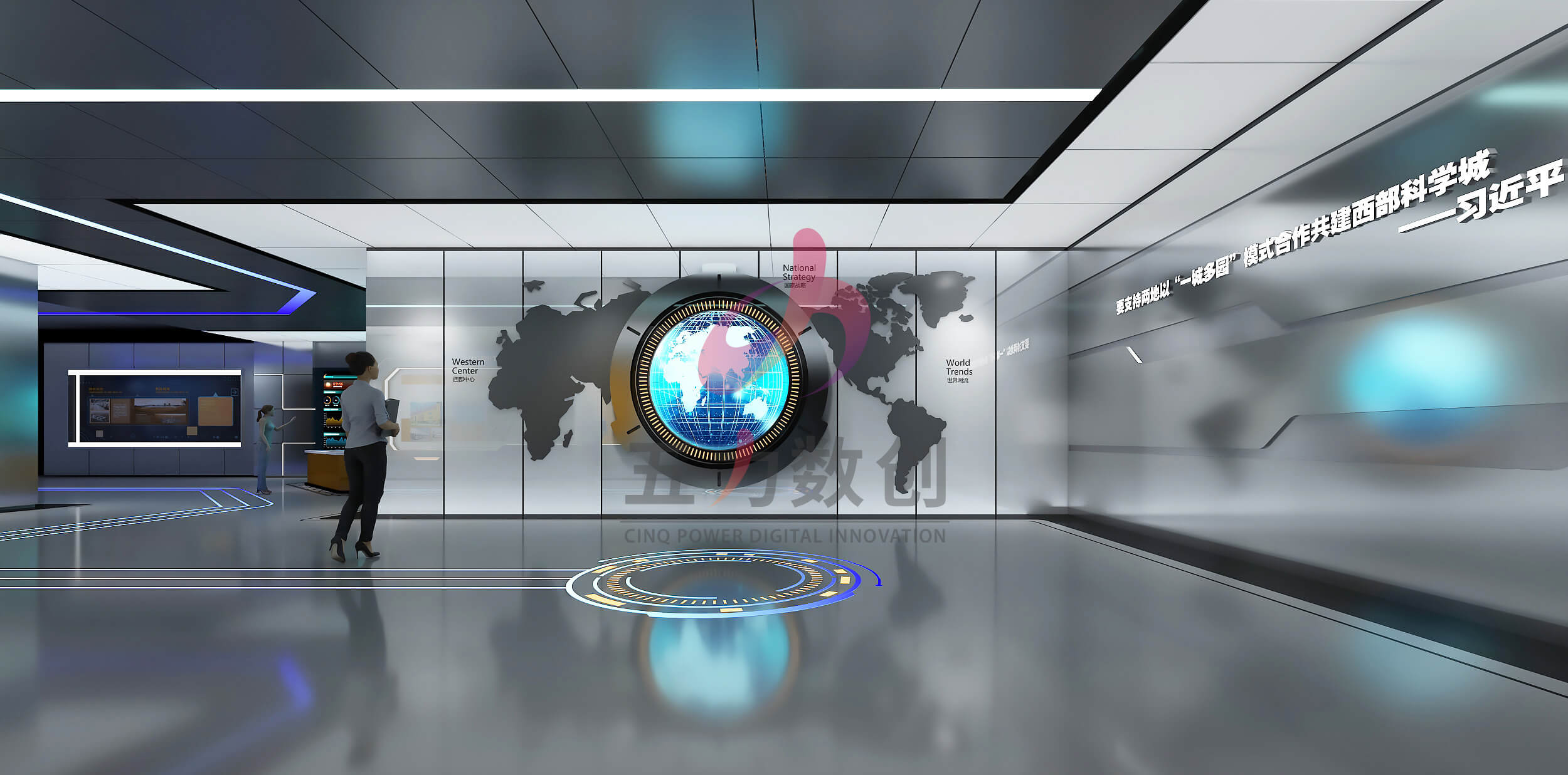 中電光谷科技城展示中心占地面積約為895㎡,共劃分為序廳,戰(zhàn)略篇、平臺篇、產(chǎn)業(yè)篇、未來篇五大展區(qū)。展廳設(shè)計以藍(lán)色和灰色為主色調(diào),營造濃厚的工業(yè)風(fēng)格;提取重慶山城設(shè)計元素和科技線條營造充滿現(xiàn)代感,科技感,未來感又獨具本地特色的展示空間。同時以數(shù)字沙盤、多媒體互動裝置、弧幕影院等多種數(shù)字多媒體展項布局,呈現(xiàn)沉浸場景,智能體驗,全方位展現(xiàn)園區(qū)項目和服務(wù),整體規(guī)劃和產(chǎn)業(yè)集聚以及優(yōu)勢成果,生動彰顯中電光谷在行業(yè)里的智造地位和強大實力,體現(xiàn)中電光谷的園區(qū)價值和孵化能力,助力招商引資。
